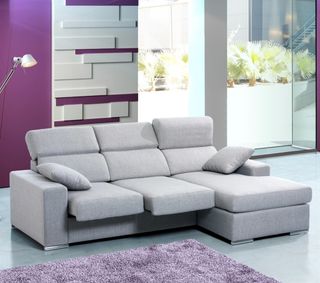 Sofá chaiselongue con un diseño moderno y comodisimo. Perfecto para tu salón. Se extiende y queda como una cama. - Tapicería de ante gris. - Cojines decorativos incluidos. - Extensible los dos cuerpos y respaldos reclinables. - 3 puf a juego.