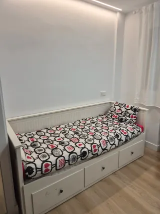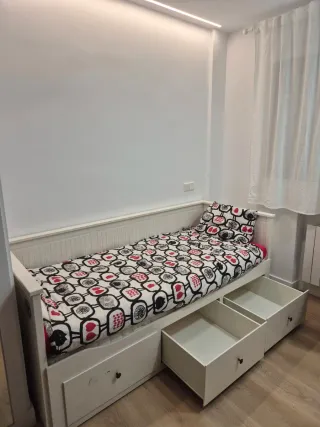 Cama nido extensible Flekke de Ikea, ideal para aprovechar el espacio. Se encuentra en muy buen estado, solo le falta una parte del colchón supletorio (se puede poner un cojín) - Estructura de color blanco. - Incluye dos colchones. - Cajones de almacenaje integrados. El respaldo se puede montar a ambos lados. Con unos cuantos cojines mullidos a modo de respaldo puedes transformar este diván en un cómodo sofá. El sofá se puede transformar rápidamente en una cama individual para así aprovechar al máximo el espacio de suelo. Tira del somier hacia afuera y obtendrás rápida y fácilmente una cómoda cama doble. Los cajones son grandes.