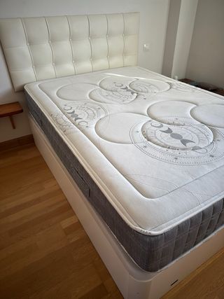 Cama de 150x190 cm formada por: - Colchón Flex Nube Visco de muelles ensacados de alta firmeza, confort y transpirabilidad y con sistema antibacteriano. Altura 30cm. - Base tapizada de la marca Poligón en tejido 3D transpirable Thermofress beige con 7 patas desmontables de madera natural. Altura 32cm con patas de 26cm. Comprados conjuntamente en diciembre de 2023 y muy buen conservados, como nuevos.