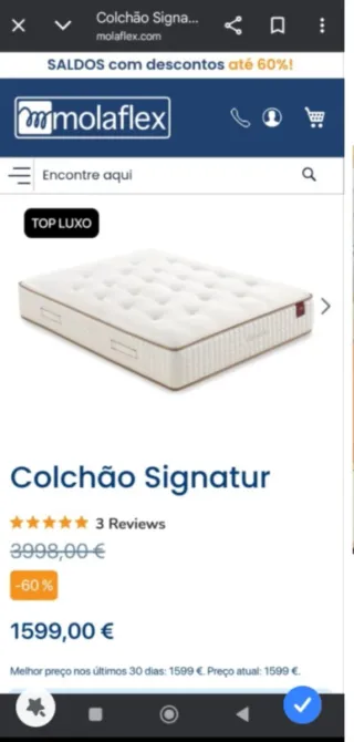 *Gran Oportunidad ÚNICA* #PROMOCIÓNES DE INVIERNO# "Precio Liquidación descuentos -30% último stock" •Precio inicial 3.998€ en Outlet 1.599€ con nosotros 1.099€(descuento 500€) *ALTA GAMA SERIE PREMIUM DE LUXE* -Marca:FLEX MOLAFLEX -Modelo:SIGNATUR -Medidas:200x200 -Firmeza:ALTA MUELLES ENSACADOS -Grosor:33'5"cm -Estado:PERFECTO,NUEVO A ESTRENAR •"PLÁSTICO SELLADO"• *GARANTÍA 3 AÑOS* ( 1 unidad en stock ) .Lo puedes venir a ver a nuestra tienda- • ENVÍO a toda la península por 59€ - PAGO CONTRAREEMBOLSO #Tienda:Vallecas-Entrevias,C/Cerro de la Alcazaba N°36 • Horarios: 10h a 21hs -Domingo: Alternado #Telf: 641235112