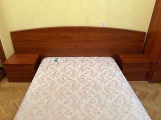 Cama de matrimonio de 150cm x 200cm Son 2 somieres de 80cm x 200cm con un colchón de muelles de 150cm x 200cm y 22cm de grosor También incluyo cabecero de Ikea con mesillas incorporadas de 240cm x 62cm casi nuevo - Cabecero de lamas de madera. - Incluye dos mesitas de noche flotantes. - Estructura de cama con base de lamas de madera. Todo está en muy buen estado Colchón completamente limpio. Cama muy poco usada
