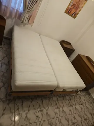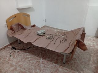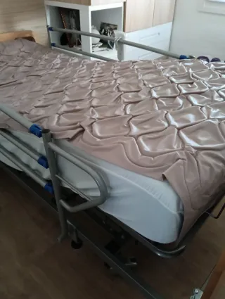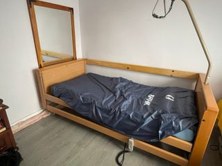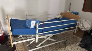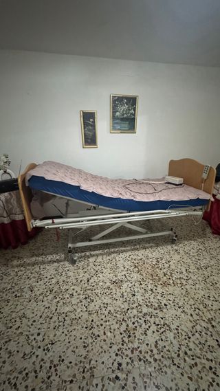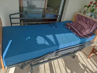 Vendo equipo de descanso geriátrico completo para domicilio. En perfecto estado. Muy poco uso y funcionamiento impecable. El pack incluye: - Cama Articulada Eléctrica: Incluye carro elevador (regulación de altura horizontal para facilitar cuidados), además de articulación independiente de tronco y piernas. - Estructura robusta: Con cabecero y piecero en madera, y barandillas laterales abatibles de seguridad. - Colchón Viscoelástico: Funda sanitaria azul, impermeable y transpirable. - Sistema Antiescaras Cymam Onís: Colchón de celdas de aire con compresor de presión alterna para evitar lesiones en la piel. Estado: Como nuevo