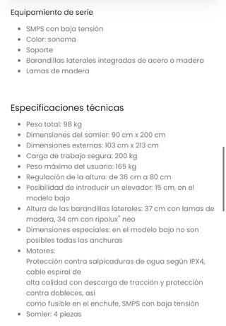 Cama articulada con un diseño moderno y funcional. - Estructura principal de madera. - somier de metal. -colchon especial para escaras de 90cm - sistema motorizado - se ha usado muy poco