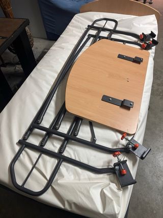 Cama articulada con estructura de madera y colchón de tela. Barra de trapecio y mesa auxiliar ajustable. 350 euros cama, 70 euros trapecio y 25 euros mesa - Marco de madera. - Colchón de tela azul.