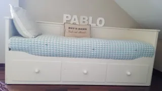 Cama de la serie Hemnes de Ikea. - Estructura de pino. Cajones chapa de melamina. - Color blanco. Sirve de sofá, cama individual, cama doble y almacenaje. Todo en un único mueble. Tirando del somier se obtiene cama doble. Para ancho de colchón 80 cm. Precio nueva en ikea 329 euros. No dudes en preguntarme cualquier información adicional. Ya se entrega parcialmente desmontada para mejor transporte. Está sin apenas uso en muy buen estado.