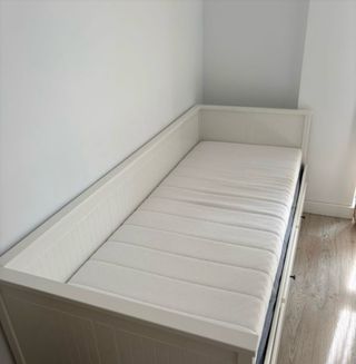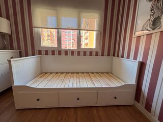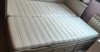 Se vende diván cama modelo Hemnes de Ikea, en muy buen estado. Incluye dos colchones Vannareid valorados en 139 euros cada uno. Ha dormido un niño pequeño únicamente durante dos/tres años. Tiradores Zara home. A recoger en zona de Rios Rosas, se ofrece plaza de garaje para el desmontaje. - Estructura de madera. - Color blanco. - Fundas de colchón extraíbles.