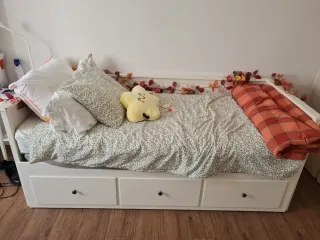 Cama diván modelo Hemnes de Ikea. Un mueble versátil y funcional para cualquier habitación. Vendo con 2 colchones IKEA. Sin uso, esta come nuevo. Precio compra total 500 e - Diseño clásico y elegante. - Tres cajones integrados para almacenamiento. - Estructura de madera robusta.