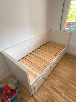 Diván modelo Hemnes de Ikea, ideal para aprovechar el espacio. - Estructura de madera y metal. - Acabado en color blanco. - Incluye cajones de almacenaje. Cuento con dos colchones 20€ cada uno