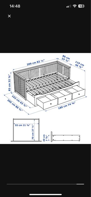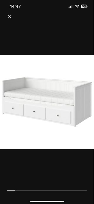 Diván Hemnes de Ikea en perfecto estado. Ideal para cualquier habitación. - Estructura de madera. - Cajones de almacenaje integrados Dos colchones disponibles en perfecto estado NO incluidos en el precio. 300 euros el conjunto