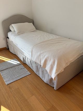Estructura de CAMA+COLCHÓN NUEVO. Tapizada IKEA modelo RAMNEFJÄLL. Comprado octubre costó 300€ TODO. Nueva está desmontada. - Medidas: 90x200 cm. - Color: Kilanda beige claro. - Incluye somier Luröy.