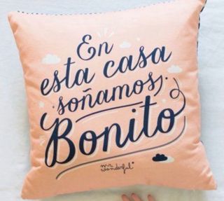Cojín decorativo con la frase En esta casa soñamos bonito de Mr. Wonderful. - Diseño con frase inspiradora. - Tono suave y agradable a la vista. - Se vende unidades sueltas o pack de 4 por 38€