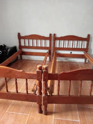 Se venden dos estructuras de cama individuales completas. No están montadas,están sobre puestas - Medida: 90 cm cada una. - Material: Madera.
