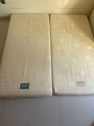 Se venden dos colchones individuales de la marca Star, cada uno con medidas de 90x200 cm. - Tejido de tela. - Diseño con patrón circular en uno de ellos.