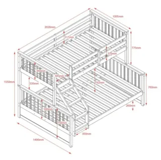Litera de madera con cama de matrimonio abajo y cama individual arriba. Incluye escalera lateral. - Estructura robusta de madera. - Posibilidad de hacerse 2 camas independientes (una de 1,35 y otra de 0,90). * Se entrega desmontada con las instrucciones de montaje. Precio original: 459€ Año de compra: 2024