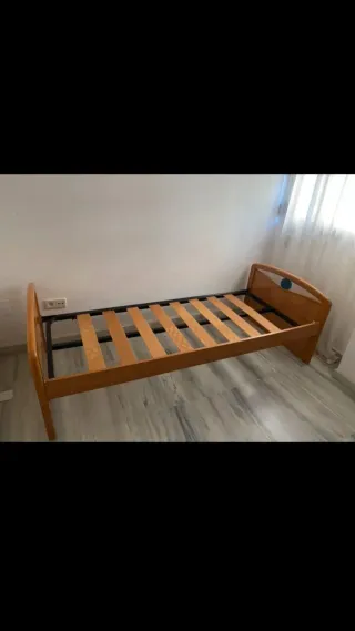 Estructura de cama individual de madera. precio 45 € - Medidas: 90 cm de ancho. - Acabado en tono madera natural. - También tengo Escritorio de madera en buen estado. Ideal para estudio u oficinas. Precio 27€. Ancho 150 cm, fondo 57 cm, alto 76 cm. Cajones 27 cm ancho. Se desmonta para su traslado. - Estantería de madera en color marrón para colgar en la pared. Está en buen estado y lista para usar. Ancho 150 cm, fondo 38 cm. Precio 15 €. - Mesita de noche Bonita mesilla de noche de madera, en muy buen estado. Altura 58 cm, fondo 48 cm, ancho 41 cm. Precio 37 €.