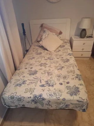 Vendo cama individual de 90cmx190cm en buen estado. Incluye mesita de noche, somier y colchón con funda, lista para usar. Ideal para habitación infantil, juvenil, invitados o pisos de alquiler. Diseño neutro y tamaño práctico para espacios pequeños. ✔ Medida: 90 cm de ancho x 190 cm de largo ✔ Incluye: somier + colchón ✔ Estado: buen estado, uso normal ✔ Precio: 55 €