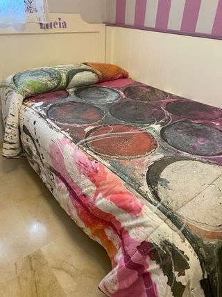 Estuctura de cama de 90, que incluye el cabecero, el somier de madera y el colchón con su colcha de flores. Hay disponible dos unidades, cada unidad cuesta 80 euros.