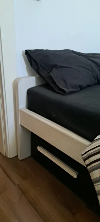 Cama individual con un diseño moderno y limpio. - Estructura de madera. - Colchón con funda de tela. - Medida colchon 200x90 - Colchon viscolastica con muelle ensacado, no tienen ni tres años - No se envia - Recogida en Rubi