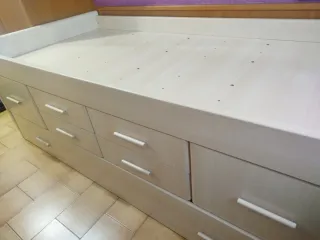 Se vende cama individual con cabecero, ideal para habitaciones. - Medidas mueble: 217,50*120'50cm, altura 24'5cm. - Estructura de madera hecha a medida. - Color beige y marrón oscuro. - Cajón bajo cama negro a medida. - NO INCLUYE COLCHÓN. - Se puede usar colchón de 190 o 200 * 90.