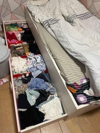 SI LA RECOGEIS HOY DOMINGO 22/03/26 90€ (Y DESMONTADA) Cama individual elevada con espacio de almacenamiento integrado. - Estructura de madera clara. - Cajones frontales con tiradores blancos. - Base de cama con orificios. -Cama supletoria debajo No va con los colchones. Midas de largo son 2metros, de ancho 99cm y de alto 69cm. Cada cajón son de 45cm.