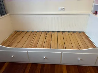 Se vende cama diván modelo HEMNES de Ikea, con colchón incluido. Ideal para habitaciones infantiles o juveniles. - Estructura de madera. - Color blanco. - Tiradores de madera nuevos (se entregan originales). Colchón incluido MAXCOLCHÓN, se adjunta imagen fecha de compra y precio original. *Tabla lateral interior rota en un enganche, no afecta a la cama ni se ve, de ahí el precio.*