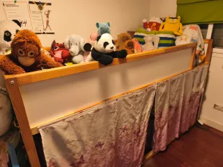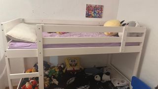Cama nido infantil de madera blanca con una cama adicional debajo: la solución ideal para cuando se queda a dormir un amigo. Incluido: - 1x cama superior - 1x cama adicional dejado - 1x colchón superior con estampado de rayas rosas - 1x colchón inferior blanco - 1x topper de comfort para la cama superior como nuevo (Ikea Nordberget - se vende por €100) - 2x protectores de colchon (de Ikea, se venden €20 cada uno) Los cochones estan sin manchas - siempre se han usado con protector. La estructura tendra que ser desmontada porque no cabe en el asensor. Con la cama, regalamos un oso gigante de 180cm monisimo!