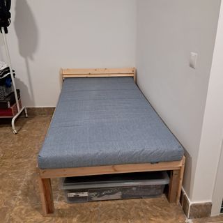 Conjunto de cama Ikea modificada, se ha acortado a 180 cm y elevado para permitir almacenamiento. Ancho 90 cm Largo 180 cm Comprada en 2025, no se ha llegado a usar. Precio de IKEA 148,99€ Se venden las 3 piezas en conjunto Ideal para cama infantil o adulto de 160 cm máximo. Entrega en Ripollet Incluye: - Estructurra de cama modificada de 90 x 180 cm madera maciza de pino resistente y natural -Somier de láminas 90 x 200 cm Láminas curvadas que consiguen sensación de elasticidad, se amoldan a tu peso corporal y crean una base flexible para el colchón. -Colchón espuma, firme/azul claro 10 cm de alto (se ha acortado a 180 cm)