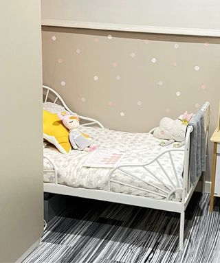 Cama infantil con un diseño encantador y detalles que la hacen especial. - Estructura metálica resistente. - Colchón con funda de tela. - Funda nórdica con estampado de corazones.