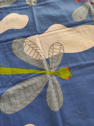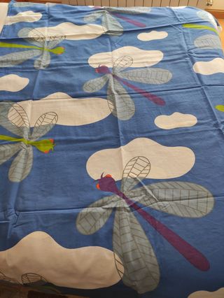 Funda para cama de 90. Reversible: por un lado libélulas y por el otro nubes. incluye un cuadrante para cojín. en perfecto estado.