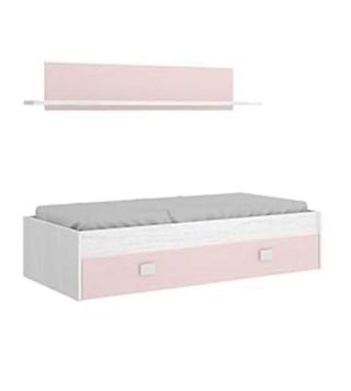 Conjunto de muebles para habitación infantil o juvenil en tonos rosas y blancos. - Armario superior con puertas. - Cama con cajón. - Estanterías laterales.