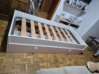 Cama infantil con un diseño moderno y funcional, ideal para habitaciones de niños. Se vende por cambio a canapé. La cama venia sin somier ni colchón, pero lo vendo con el somier incluido, el colchón es aparte. - Estructura de madera. - Cajones integrados para almacenamiento. - Estantería incluida si gustan. - El colchón es aparte.