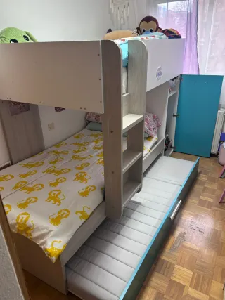 Se vende cama nido de 90 cm, ideal para habitaciones infantiles o juveniles. Su diseño es moderno y funcional. - Estructura de madera resistente. - Incluye somier. - Colchón inferior incluido. ZONA BARRIO DE LA CONCEPCIÓN LA PERSONA INTERESADA DEBE ENCARGARSE DE DESMONTARLA Y TRANSPORTARLA.