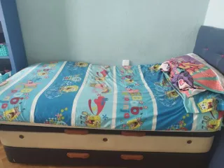 Se vende cama individual de 90cm, lista para usar, con otro somier debajo. Cómoda y escritorio. Regalo colchón. Funda, edredón, almohada y colcha, dos estanterias y un corcho - Estructura de madera. - Colchón azul. - Ropa de cama rosa con diseño de rayas.