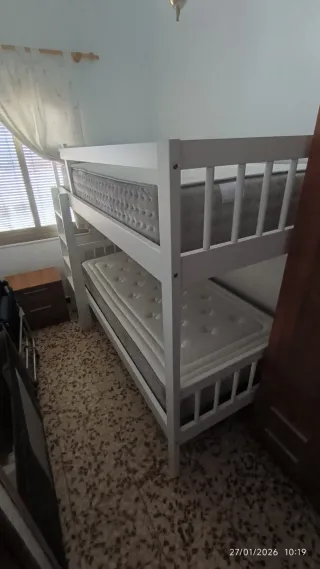 SOLO HOY!!!! URGE POR MUDANZA Litera de madera en color blanco, ideal para habitaciones infantiles o con poco espacio. Precio de la litera 50€. Sus medidas incluyen la escalera. Los 2 colchones de viscoelastica, se venden por separado. El de arriba está como nuevo y serían 60€ y el otro tiene en la tapiceria un par de enganchones, éste serian 40€ - Estructura de madera robusta. - Diseño moderno y funcional. Se recoge en Adra, Almería