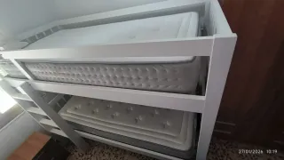 Vendo literas plegables. Según se puede ver en las imágenes se puede recoger dentro de un armario y así tener más espacio en la habitación. Viene con una mesilla a juego y 2 colchones. Se ha usado poco tiempo debido a que nos hemos mudado y no la usamos. Un saludo