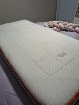 Colchón infantil Finn de Baby matress, diseñado para el descanso de los más pequeños. - Tejido superior blanco acolchado. - Colchón de doble etapa con muelles ensacados y airflex Foam en el interior, que permite ventilación. - Funda extraíble con cremallera y lavable. Tenemos también ropa de cama: juego de bajera y edredon con funda finito de los que se cierran con cremallera para que no se destapen (valorada en 42 euros), 3 sabanas bajeras de algodon, y funda nordica de animalitos, mas otro edredon