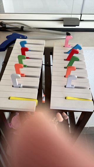 Conjunto de 2 percheros infantiles con un diseño inspirado en un piano. Son 7 perchas de colores en cada uno. 12 € en total por los dos - Diseño original de piano. - Siete perchas de diferentes colores: gris, azul, rojo, verde, naranja, morado y amarillo. - Ideales para habitaciones infantiles.