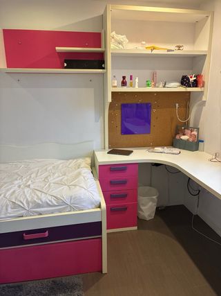 Se vende habitación juvenil en tonos rosa, blanco y gris oscuro Ideal para crear un espacio personal y acogedor. Cama de 1,05 y la de abajo de 90 cm con tres cajones de almacenaje y de alta 1 metro. Escritorio de 2,70 y debajo un zapatero. Incluye sinfonier de 40*55 y dos estanterías