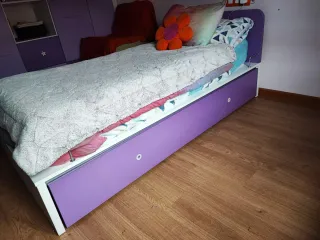 Mueble juvenil con un diseño moderno y funcional, ideal para optimizar el espacio. El precio es de 550€ no negociable ya que nuevo costó 3.000€ Incluye colchón si se desea, y sino resto 100€ nada más. No marear porfavor. Seriedad - Puertas correderas en color lila. - Base en color gris oscuro. - Tirador integrado.