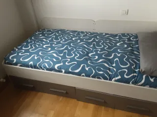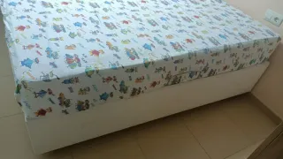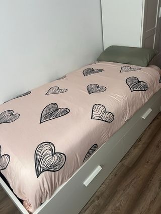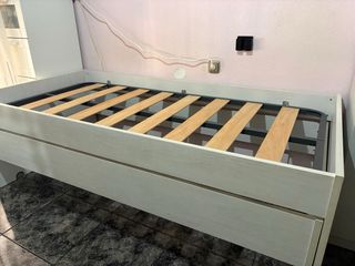 Cama individual blanca con estructura de madera y dos cajones inferiores integrados, en excelente estado y prácticamente nueva. Medidas: para colchón de 90 cm de ancho y 190 cm de largo (total con estructura aprox. 220 cm x 100 cm), ideal para dormitorios juveniles o invitados con espacio optimizado. Los cajones con ruedas ofrecen amplio almacenaje para ropa de cama o efectos personales. Incluye colchón de alta calidad en perfectas condiciones. Diseño funcional y resistente, fácil de combinar. Precio con colchon