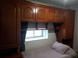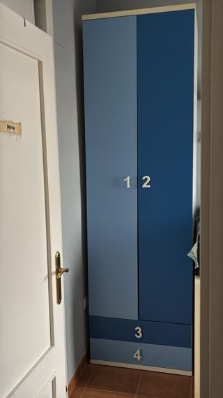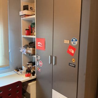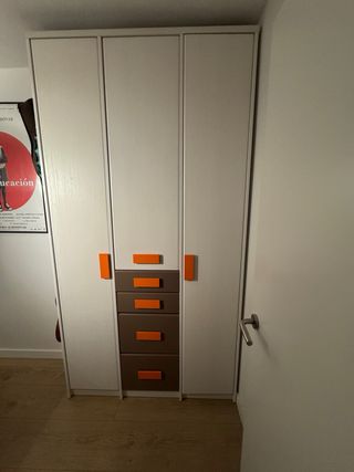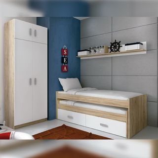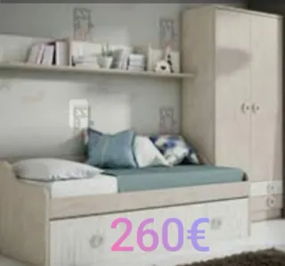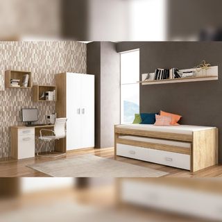 Dormitorio juvenil compuesto por un armario de dos puertas, un estante con respaldo y una cama compacta doble con cajones en la parte inferior. La cama superior es de 90x190 y la inferior de 90x180, y ambas precisan de somieres que no se incluyen en el precio del artículo.ENVIO:Se entrega en puerta de casa gratis en gijon sin montaje,con montaje tiene un costo adicional.Aviso importante: Las descripciones, imágenes, medidas y precios de los productos pueden contener errores tipográficos o variaciones. Antes de realizar tu compra, te recomendamos confirmar toda la información.