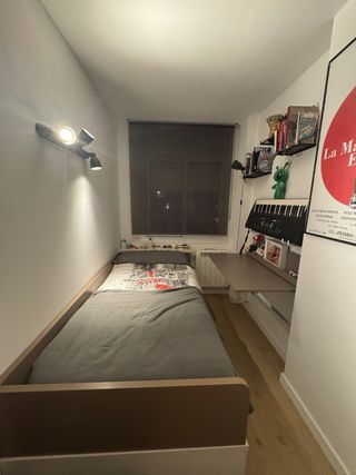 Se vende dormitorio juvenil completo por cambio de habitacion. Incluye: - soporte de cama con 3 cajoneras amplias - mesa de estudio acoplada - colchón de 90 x 190cm - estanteria con 4 estantes - arcón profundo (detrás del cabecero) - mesita de noche con dos cajones Medidas del mueble al completo: Medida del lado de la pared: 234cm Medida del lado de la ventana: 184cm En buen estado, se vende por cambio completo de la habitacion. Solo venta en persona, el transporte corre a cargo del comprador. Dormitorio infantil cama mesa estanteria mesita noche Disponibles más fotos si interesados