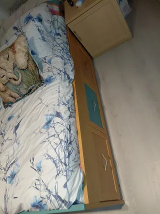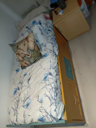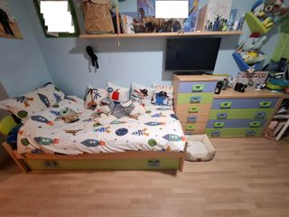 Se vende conjunto de dormitorio juvenil. - Cama con 4 cajones de bastante profundidad. - Mesita de noche. - Cajonera con 7 cajones . -Colchón de 90. En perfecto estado , se vende por mudanza . Algo negociable, escucho ofertas.