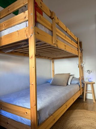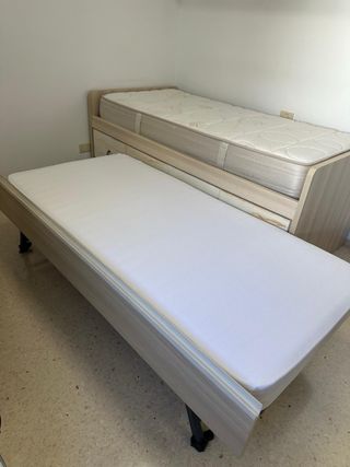 Cama nido juvenil, para colchones de 1,90 de largo por 90 cm de ancho. La estructura tiene las siguientes dimensiones: - Largo: 201 cm - Ancho: 102 cm - Alto: 81 cm (por la tabla que tiene en un lateral y que evita el roce excesivo contra la pared) Es apta para 2 camas. La inferior, una vez es sacada, puede elevarse sobre las patas que tiene, quedando a la misma altura que el otro colchon. O dejarse a ras de suelo, ya que dispone de ruedas) Se entrega con los 2 somieres, SIN COLCHONES NI ROPA DE CAMA, solo la estructura. Se recoge en zona Santa Eugenia (Villa de Vallecas)