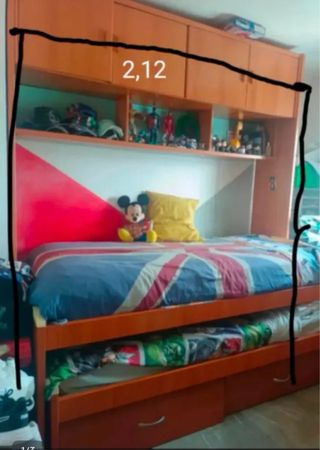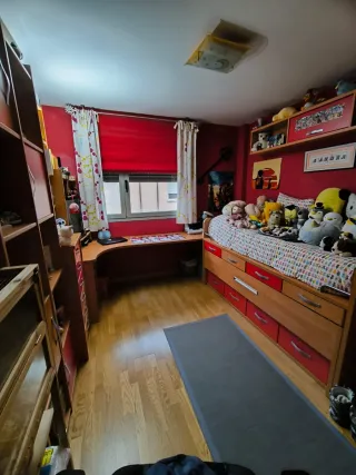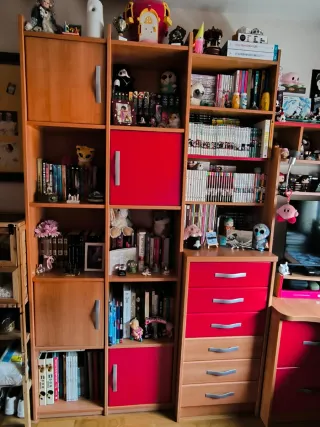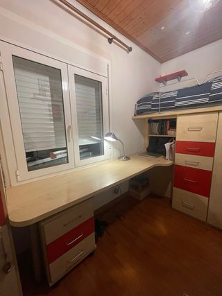 Vendo conjunto completo de muebles de habitación juvenil en perfecto estado. Incluye: Cama alta con barandilla y escalera Escritorio amplio con cajonera Armarios y estanterías integradas Módulos con cajones y puertas Color madera clara con detalles en rojo. Muy práctico para aprovechar espacio, ideal para habitación pequeña o juvenil. Todo es robusto y funcional, sin roturas. ❗️No hago envíos, solo recogida en mano. ❗️Habría que desmontarlo. Medidas aproximadas: Estructura cama: 2.10 x 0.90 Escritorio: 2m