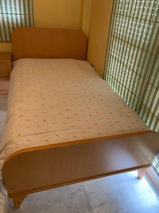 Vendo conjunto de dormitorio juvenil en madera de haya compuesto por: - Cama (incluye colchón): largo 2,10 m; ancho 1,15 m. Colchón: 1,05 × 2,00 m. - Mesita de noche: alto 54 cm; ancho 40 cm; fondo 38,5 cm. - Estantería: alto 2,24 m; ancho 2,40 m; fondo 28 cm. - Cómoda (4 cajones): alto 97 cm; ancho 60 cm; fondo 47 cm. - Mesa de escritorio (con cajones): ancho 1,56 m; alto 76 cm; fondo variable de 1,07 m a 60,5 cm. - 5 baldas: grosor 3 cm; ancho 90 cm; fondo 26,5 cm. - Espejo: alto 1,70 m; ancho 80 cm. Precio indicado para el conjunto pero se venden por separado los muebles.