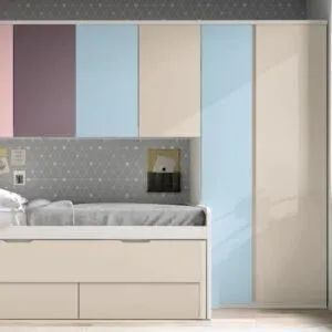 Dormitorio juvenil del que podemos destacar su gran cantidad de espacio. El armario ocupa todo el rincón, tenemos también el altillo puente de 4 puertas y gran capacidad y debajo la cama compacta con una cama extraíble y prácticos cajones de gran capacidad. Escritorio no incluído en la oferta.Diferentes combinaciones de color.Medidas de la composicion 95 x 341.Altura 220 SOMIER NECESARIO EN LA CAMA DESPLAZABLE +50€. Transporte y montaje opcional 200€(hasta 15 km).