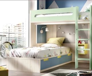 Dormitorio puente juvenil con excelente gama de acabados y calidad,(único en su oferta al ofrecer colores lacados sin incremento en el precio) con altura de 240 cms Composición compuesta por armario de 2 puertas,altillo puente y cama con doble de cajones. Escritorio opcional no incluído en la oferta +275€. Diferentes opciones de color. Envio y montaje 175€ (hasta 15 km).