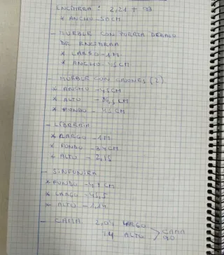 Habitación juvenil tal y como se ve en las fotos Largo encimera: 2,83 m Fondo encimera:54 cm Alto encimera: 84 cm Estantería: 1,05 m por 1,00 m Cada cubo: 44 por 44 cm Largo cama: 2,02 m Ancho cama: 1,02 m Alto cama: 73 cm ( hasta donde apoya el colchón) La cama dispone de otra cama supletoria debajo