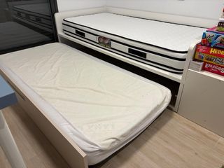 Cama nido juvenil de 90x190cm con un práctico arcón. - Incluye cama superior y cama inferior extraíble. - Diseño moderno y funcional. - Colchones incluidos, el superior está más usado, pero el de abajo está en perfecto estado. - Tiene pequeños desperfectos que se pueden ver en las fotos, del uso. - Su precio sin colchones está en tienda en más de 600€. - Es una cama muy cómoda y con almacenamiento. - La vendo por cambio de habitación por logística.